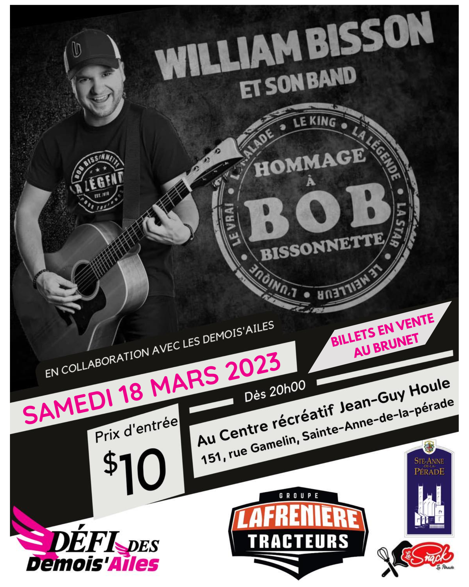 Billet en vente auprès des Desmois'ailes (Maryse Bellemare et Julie Balleux) et de la pharmacie Brunet